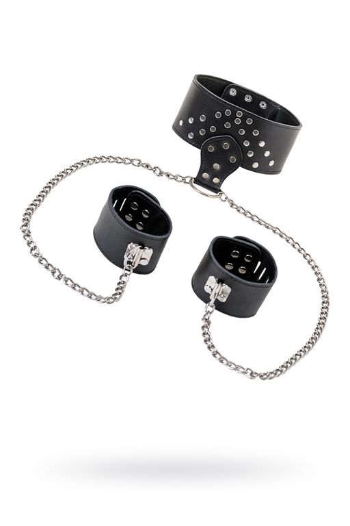Этот стильный чёрный ошейник из натуральной кожи с блестящими заклёпками соединён 50-сантиметровой металлической цепью с мягкими кожаными наручниками. Он настолько привлекателен и удобен, что примерив ошейник однажды, не захочется отказаться от его использования в дальнейшем.
