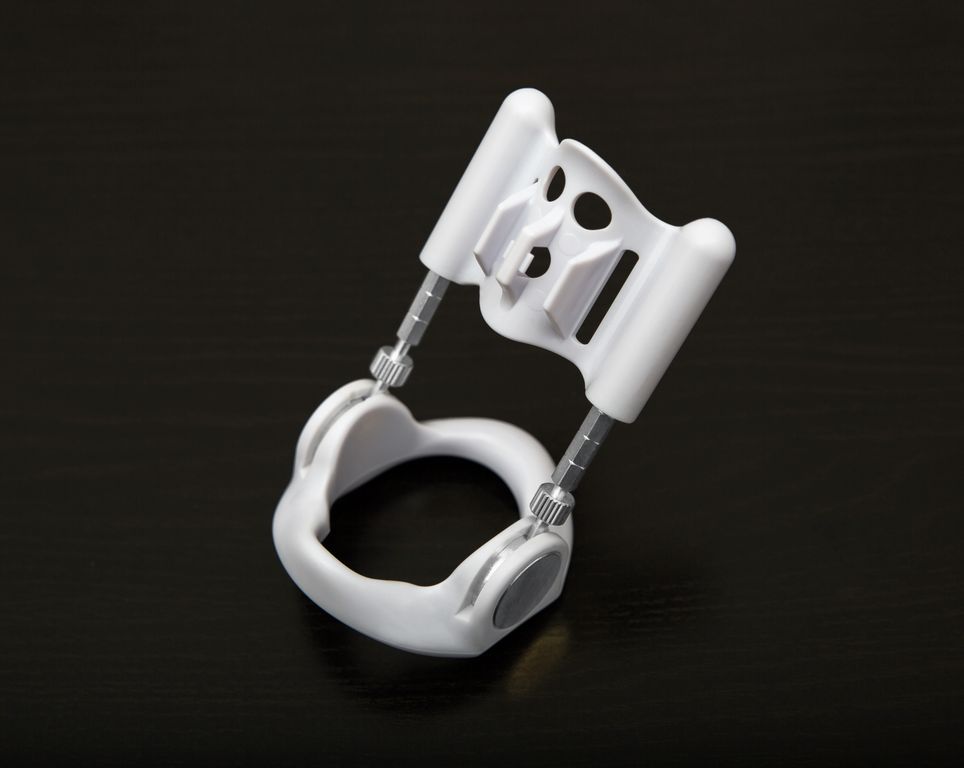 Вставьте член в кольцо экстендера так, чтобы оно оказалось у основания пениса. Отрегулируйте высоту штанг, при необходимости добавьте стержни для создания идеальной длины прибора. Поместите головку на пластмассовой опоре и зафиксируйте с помощью силиконового жгута.