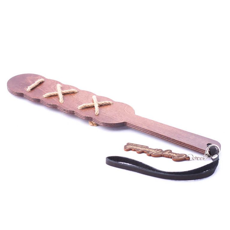 Коричневый деревянный паддл с оплеткой из джутовой веревки. На конце ручки поводок для фиксации в руке. Предназначен для жесткой порки.