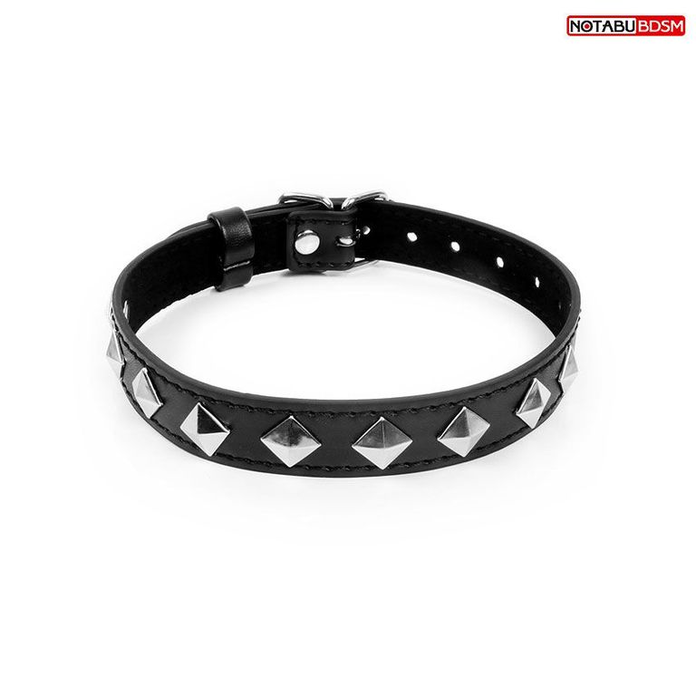 Оригинальный ошейник для любителей БДСМ-игр, декорированный металлическими украшениями. Имеет возможность регулировки размера с помощью ремешков.
