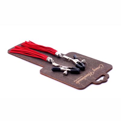 Зажимы мягко сдавливают соски за счет резиновых наконечников, а прикосновения кисточек из замши приятно ощущаются на коже. Сила сжатия зажимов регулируется болтиками.