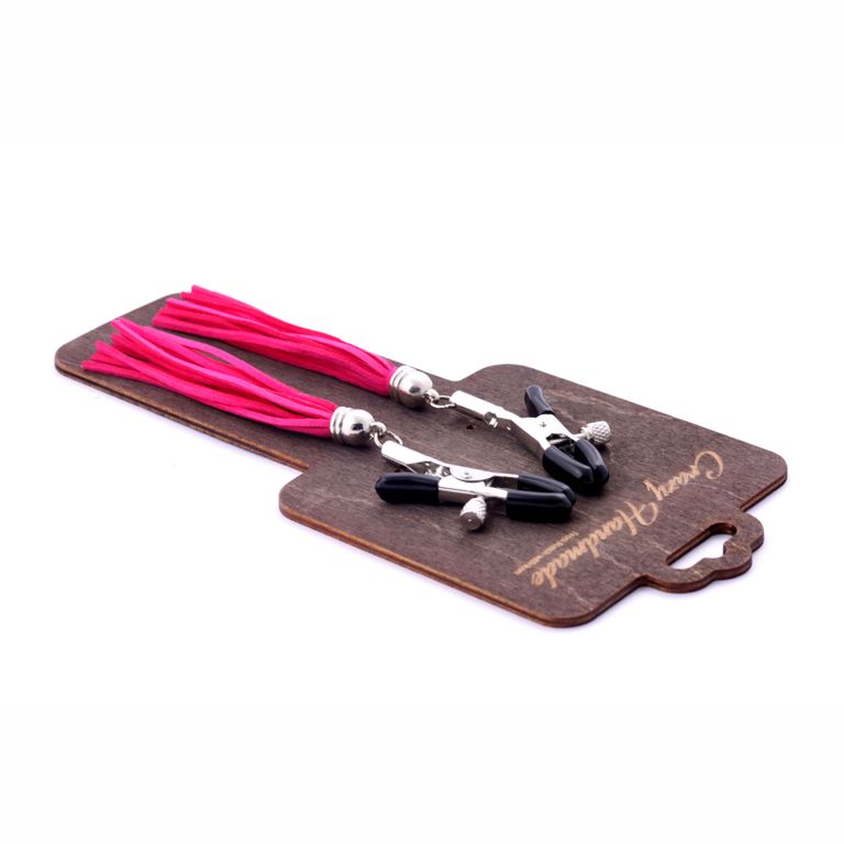 Зажимы мягко сдавливают соски за счет резиновых наконечников, а прикосновения кисточек из замши приятно ощущаются на коже. Сила сжатия зажимов регулируется болтиками.