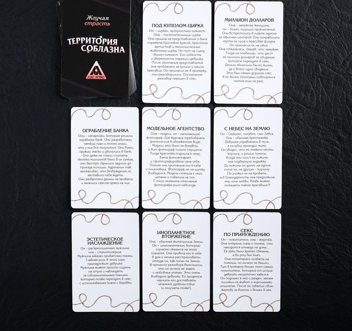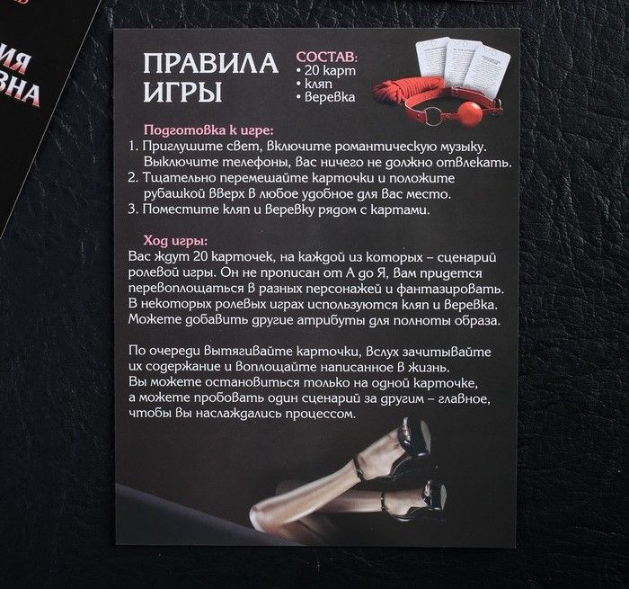 Приглушите свет, включите романтическую музыку. Выключите мобильные телефоны, вас ничего не должно отвлекать. Вас ждут 20 карточек, на каждой из которых — сценарий ролевой игры. Он не прописан от А до Я, вам придётся перевоплощаться в самых разных персонажей и фантазировать. В некоторых ролевых играх используются кляп и верёвка. Вы можете добавить и другие атрибуты для полноты образа.