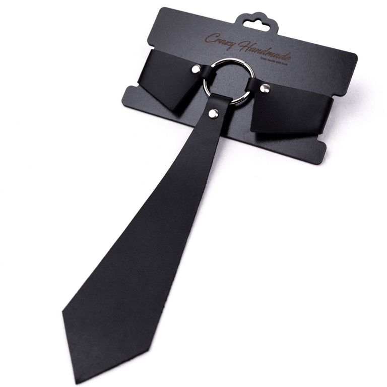 Однослойный чокер из натуральной кожи в виде классического галстука с воротником. Посередине расположено стальное хромированное кольцо.