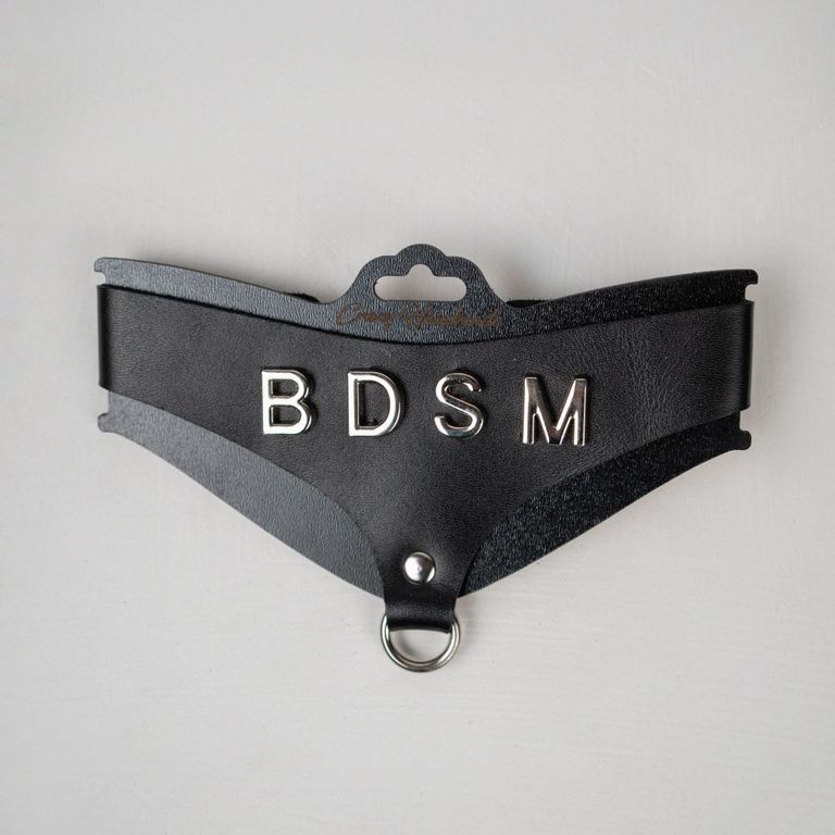 Однослойный ошейник из натуральной кожи треугольной формы. Декорирован аббревиатурой «BDSM» из фурнитуры премиального качества. В нижней части изделия расположено стальное хромированное кольцо.