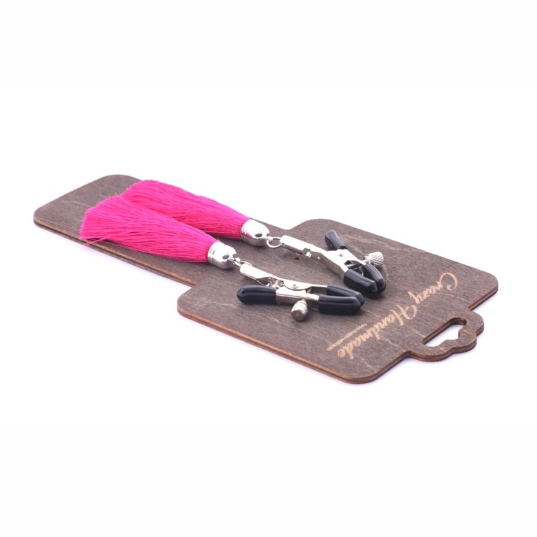 Зажимы мягко сдавливают соски за счет резиновых наконечников, а прикосновения кисточек из шелковых нитей приятно ощущаются на коже. Сила сжатия зажимов регулируется болтиками.