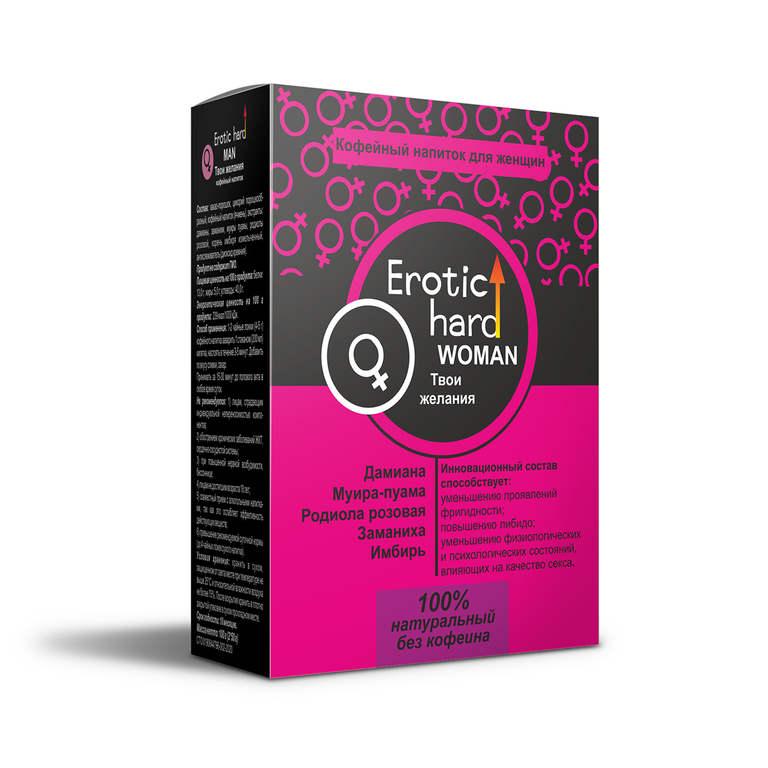 Активные компоненты: какао-порошок натуральный, цикорий порошкообразый, кофеный напиток (ячмень), экстракты: дамианы, заманихи, муиры-пуамы, родиолы розовой, имбирь молотый.