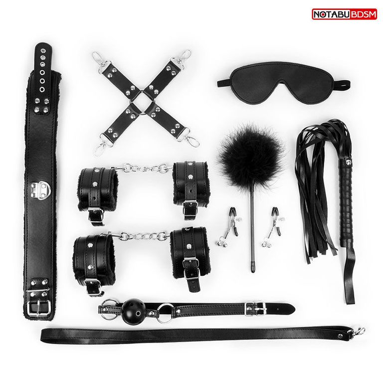 Великолепный набор аксессуаров для любителей БДСМ. В комплект входят кляп, наручники, оковы, ошейник, поводок, верёвка, маска, плеть.
