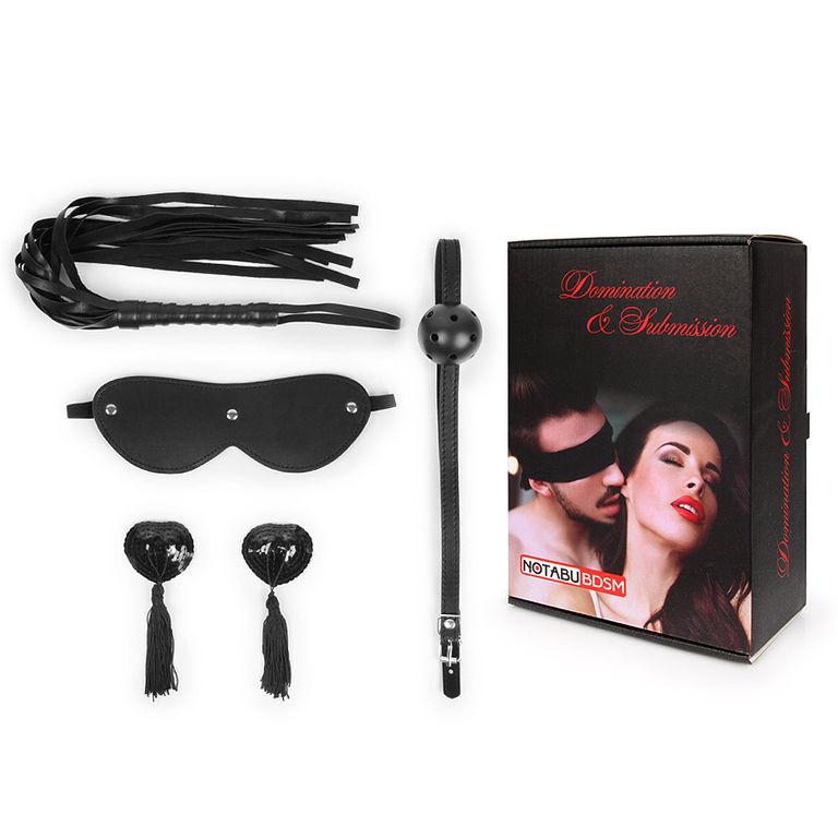 Великолепный набор аксессуаров для любителей БДСМ-игр. В комплект входят плеть, кляп, маска и пэститы для украшения сосков.