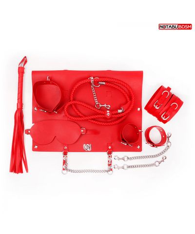 Великолепный набор аксессуаров для любителей БДСМ-игр. В комплект входят маска, фиксатор, ошейник с плетённым поводком, наручники, оковы, плеть.