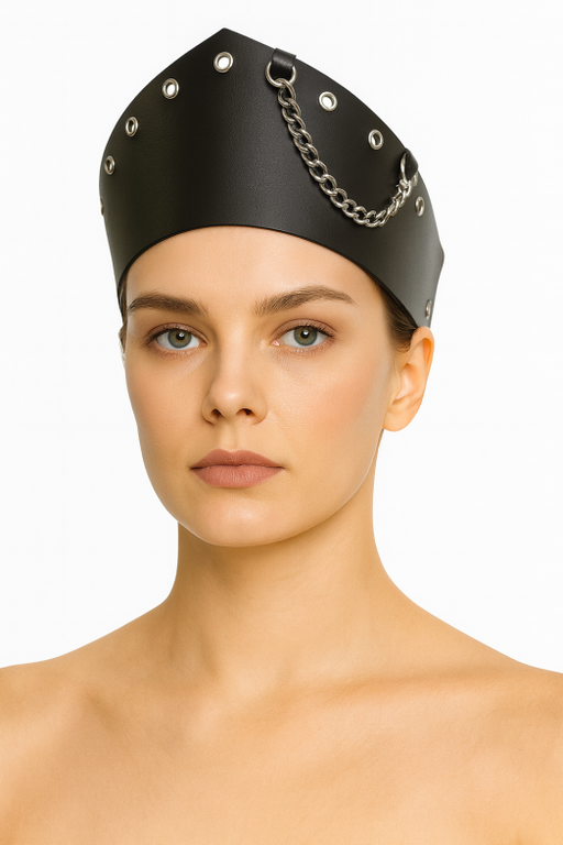 Необычный современный аксессуар, вдохновленный традициями прошлого - кокошник из натуральной качественной кожи Рогнеда. Отлично заменит обычный ободок, добавит образу изюминку и поможет создать нужное настроение. Аксессуар выполнен в черном цвете, декорирован дерзкой металлической цепочкой.. Регулировка обхвата происходит с помощью эластичной резиночки сзади, ширина резинки 1см. Высота кокошника по центру 8см, к краям плавно сужается до 4см.
