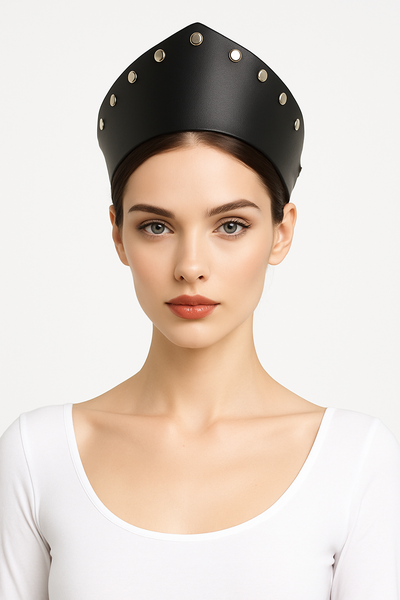 Необычный современный аксессуар, вдохновленный традициями прошлого - кокошник из натуральной качественной кожи Стелла. Отлично заменит обычный ободок, добавит образу изюминку и поможет создать нужное настроение. Аксессуар выполнен в черном цвете, декорирован металлической фурнитурой. Регулировка обхвата происходит с помощью эластичной резиночки сзади, ширина резинки 1см. Высота кокошника по центру 8см, к краям плавно сужается до 4см.